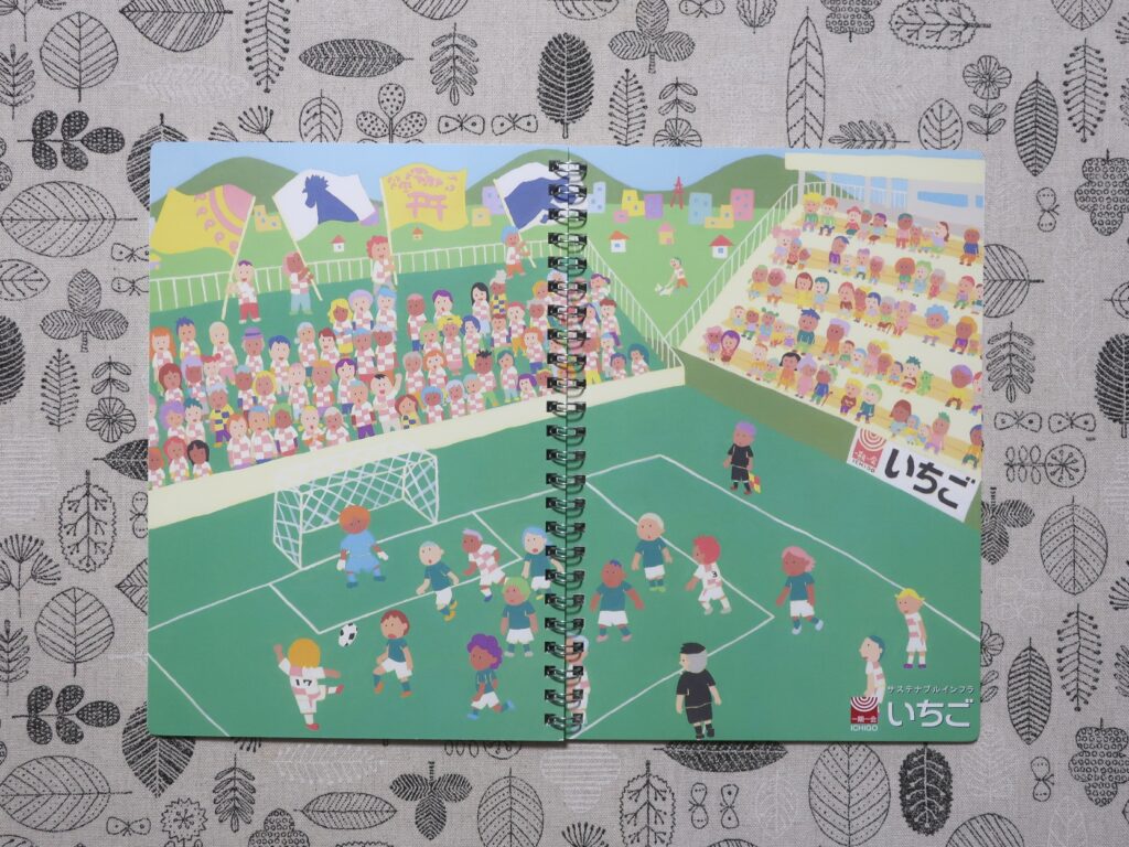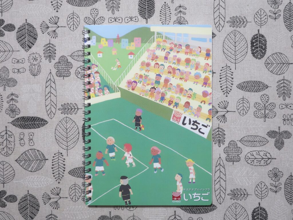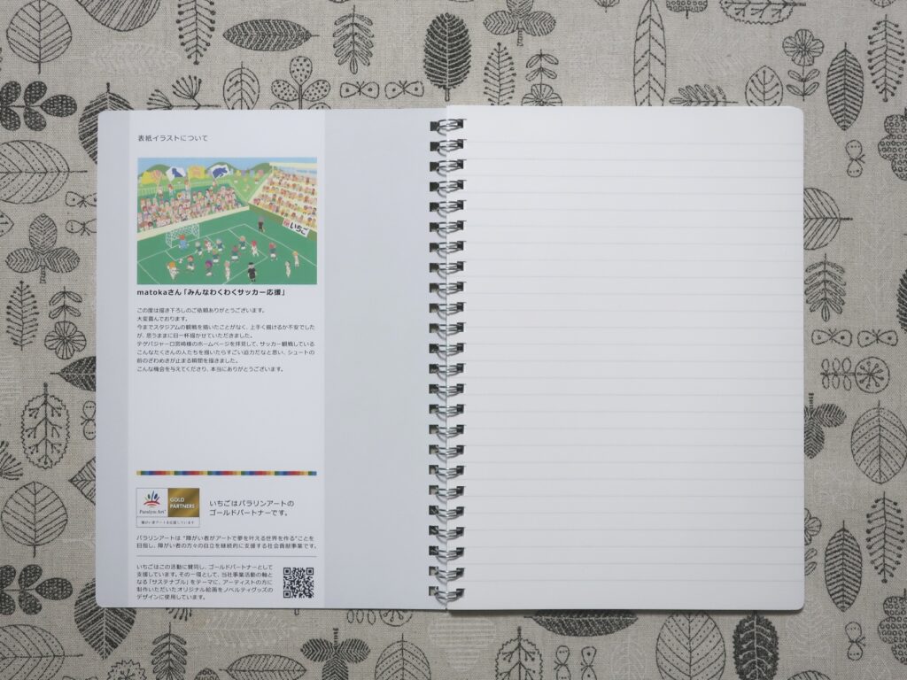 パラリンアート作家・matokaさんの作品「みんなわくわくサッカー応援」がデザインされた、温かみのある素敵なノートでした。