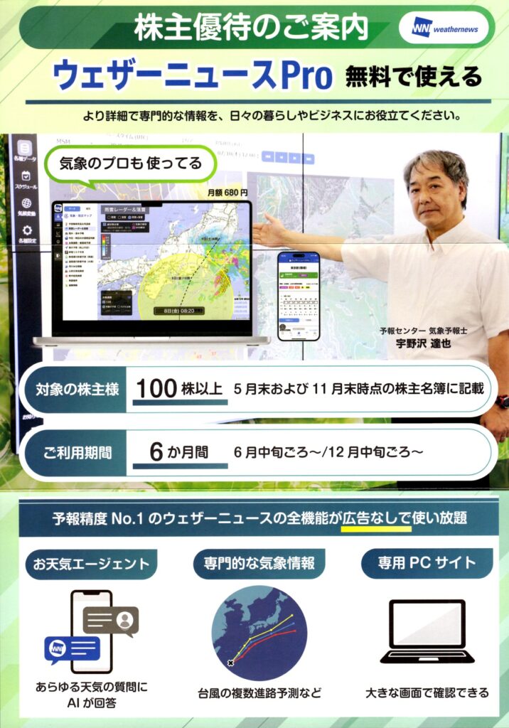| 100株以上 | 気象情報サービス 「ウェザーニュース Pro」 半年間無料利用権(1名分) |
