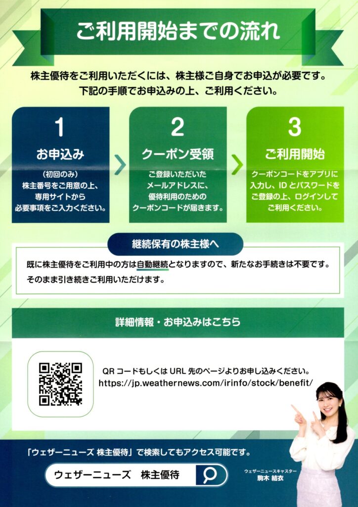 権利確定日は2024年5月末。保有株式数は100株。自動更新された「ウェザーニュースの半年間無料利用権」について紹介します。