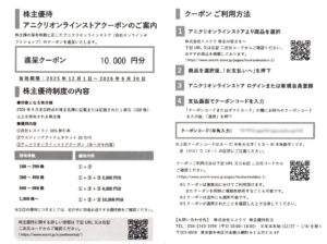 権利確定日は2025年9月末。保有株式数は1,000株。届いた優待品「10,000円分のオンラインストアクーポン」を写真で詳しく紹介します。