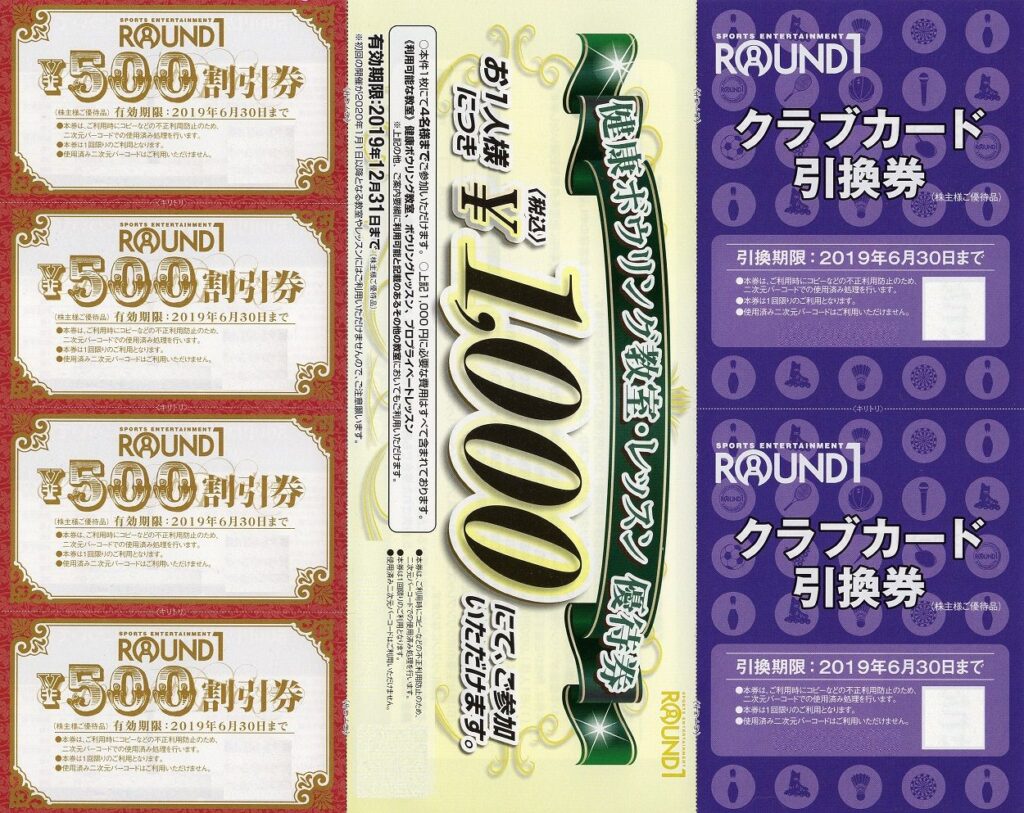 100株なので「クラブカード引換券2枚」と「500円割引券4枚」と「健康ボウリング教室・レッスン優待券1枚」です。