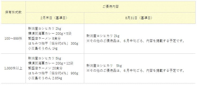 | 100株以上 | A. 新潟産こしひかり(2kg) B. 横須賀海軍カレー(200g×5袋) C. 繁盛店ラーメン(8食分) D. はちみつ梅干「塩分約4%」(300g) E. 小豆島そうめん(1㎏) | A. 新潟産こしひかり「新米」(2kg) B. 横須賀海軍カレー(200g×5袋) C. 繁盛店ラーメン(8食分) D. はちみつ梅干「塩分約4%」(300g) E. 讃岐うどん(1㎏) |