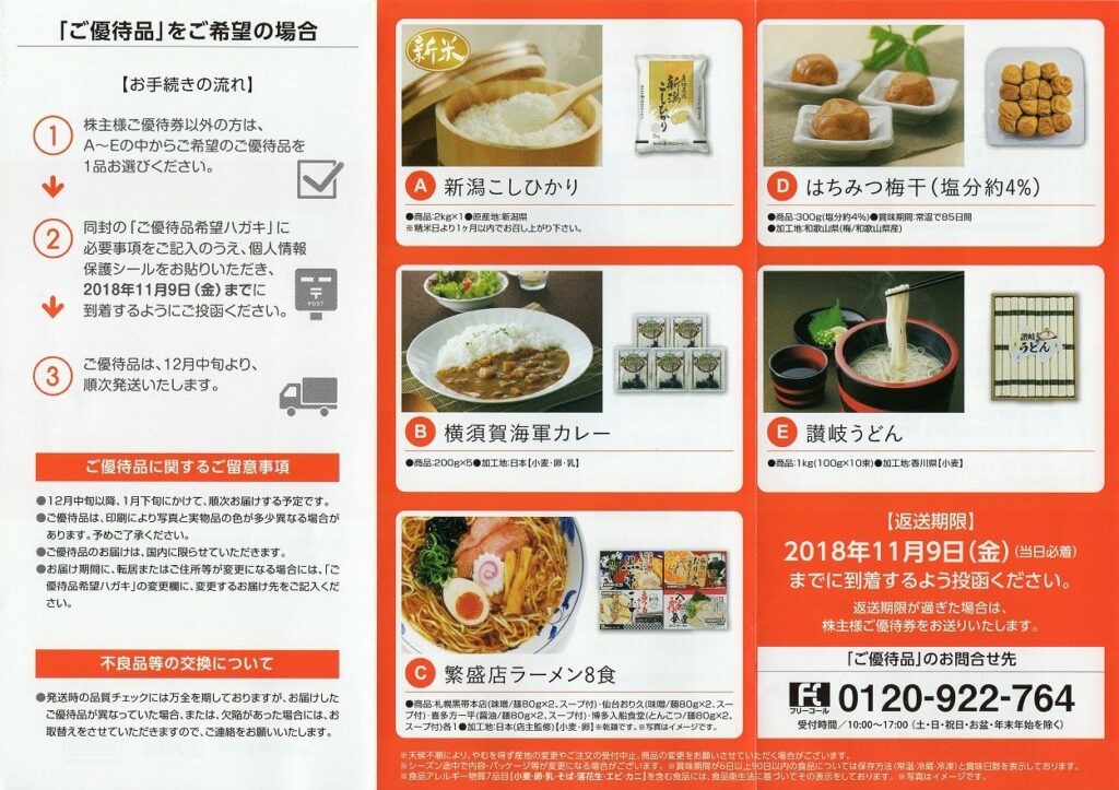 権利確定日は2018年2月末。保有株式数は100株。届いた優待案内(カタログ)を写真で詳しく紹介します。