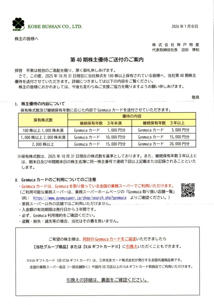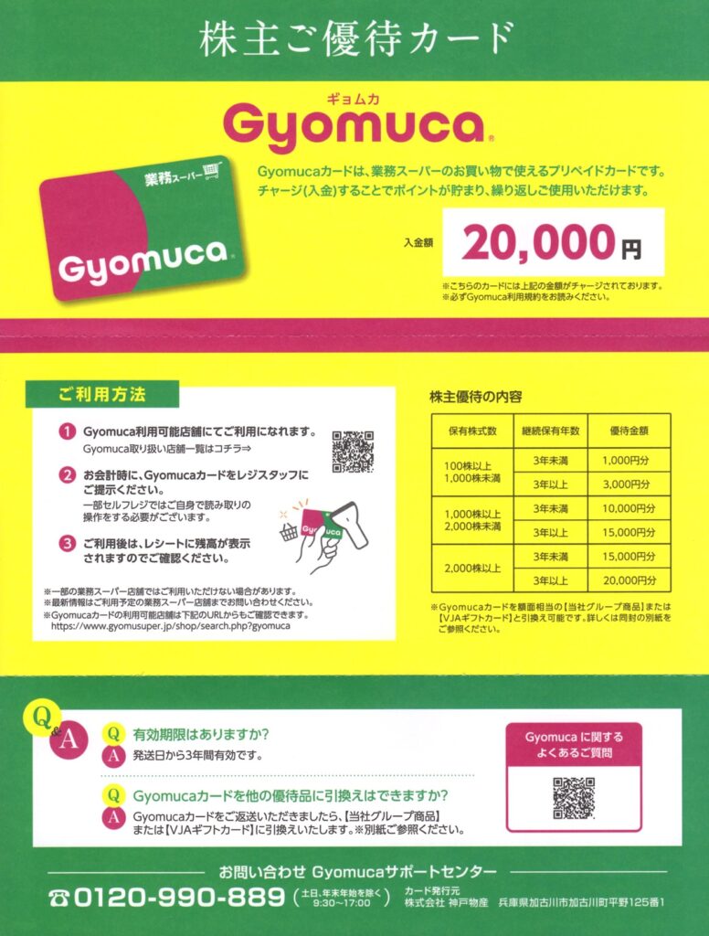 神戸物産(3038)から株主優待が到着|2,000株(3年以上)でGyomucaカード20,000円分
