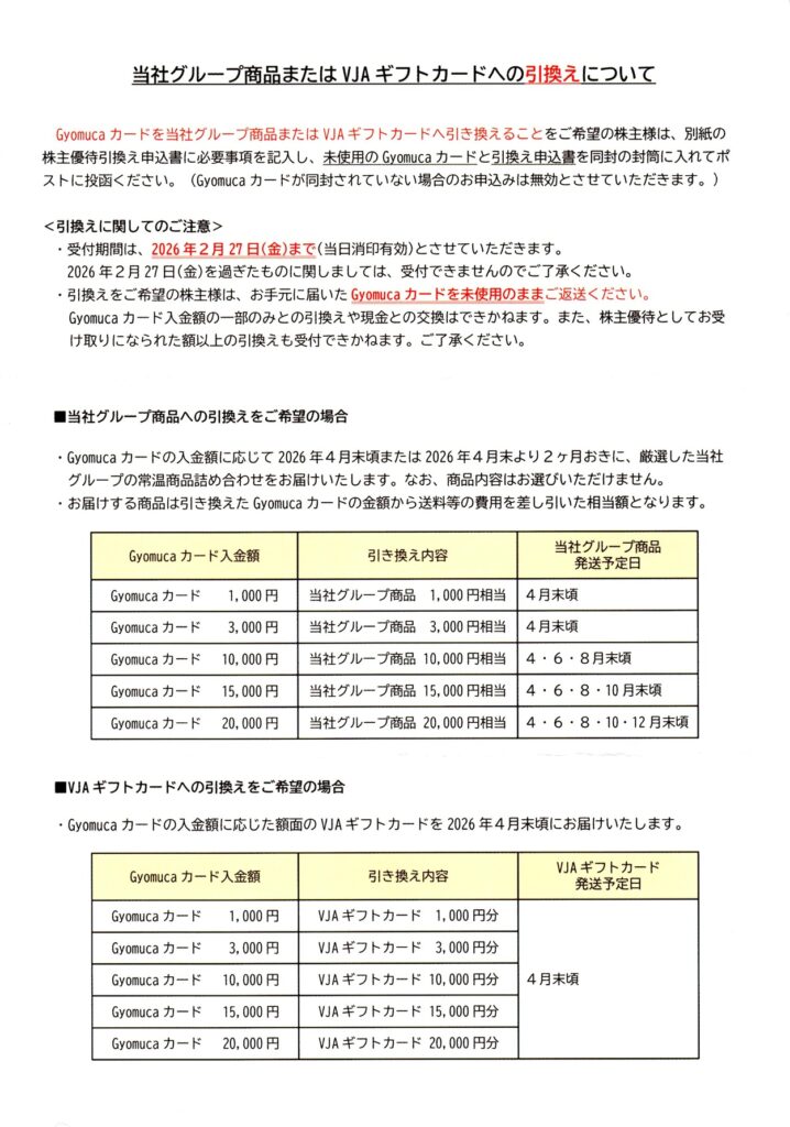 もし近くに店舗がない場合や、現金に近い形で使いたい場合は、未使用・・・のGyomucaカードを返送すると「VJAギフトカードへの交換も可能です。