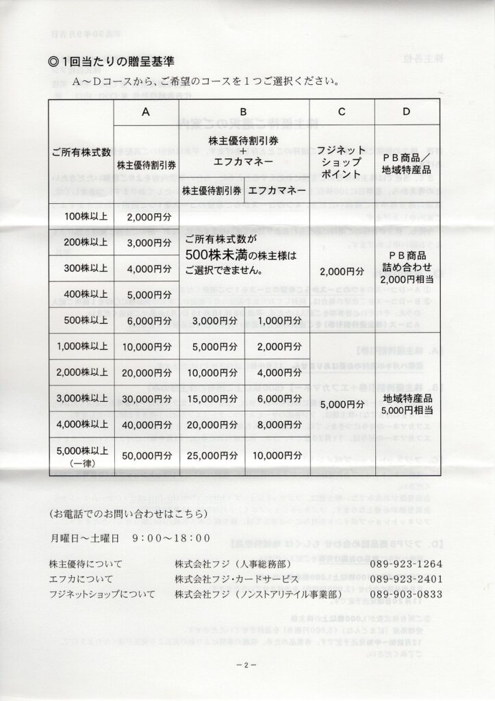 | 所有株式数 | Aコース 株主優待割引券 | Bコース 株主優待割引券+エフカマネー | Cコース フジネットショップポイント | Dコース PB商品または地域特産品 |