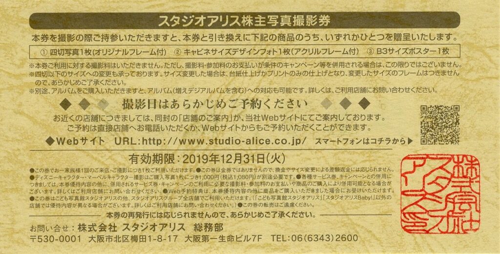 今回は、こども写真館でおなじみのスタジオアリス(2305)から届いた株主優待を紹介します。