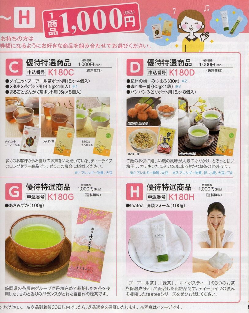 ティーライフの優待券は、同封のカタログに掲載されている優待特選商品との交換や、公式サイトでの購入に利用できます。