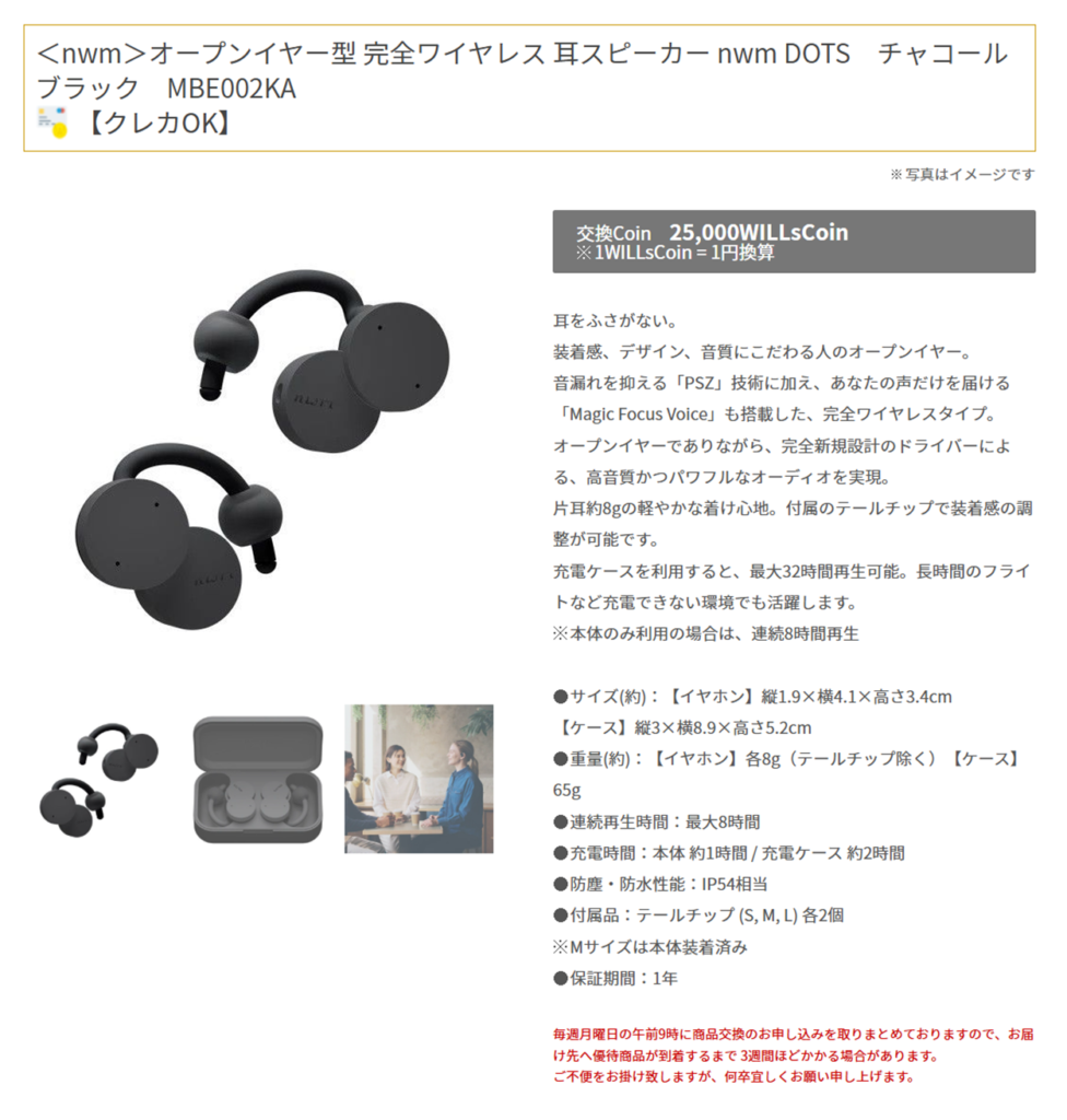 今回、25,000 WILLsCoinを使って交換したのが、NTTソノリティ製のオープンイヤー型の完全ワイヤレスイヤホン「nwm DOTS」です。
