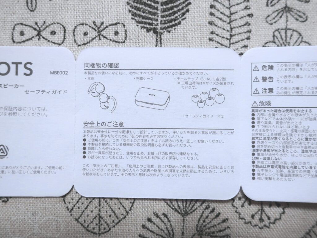 マニュアルは付属せず、セーフティガイドの紙が1枚入っているだけでした。