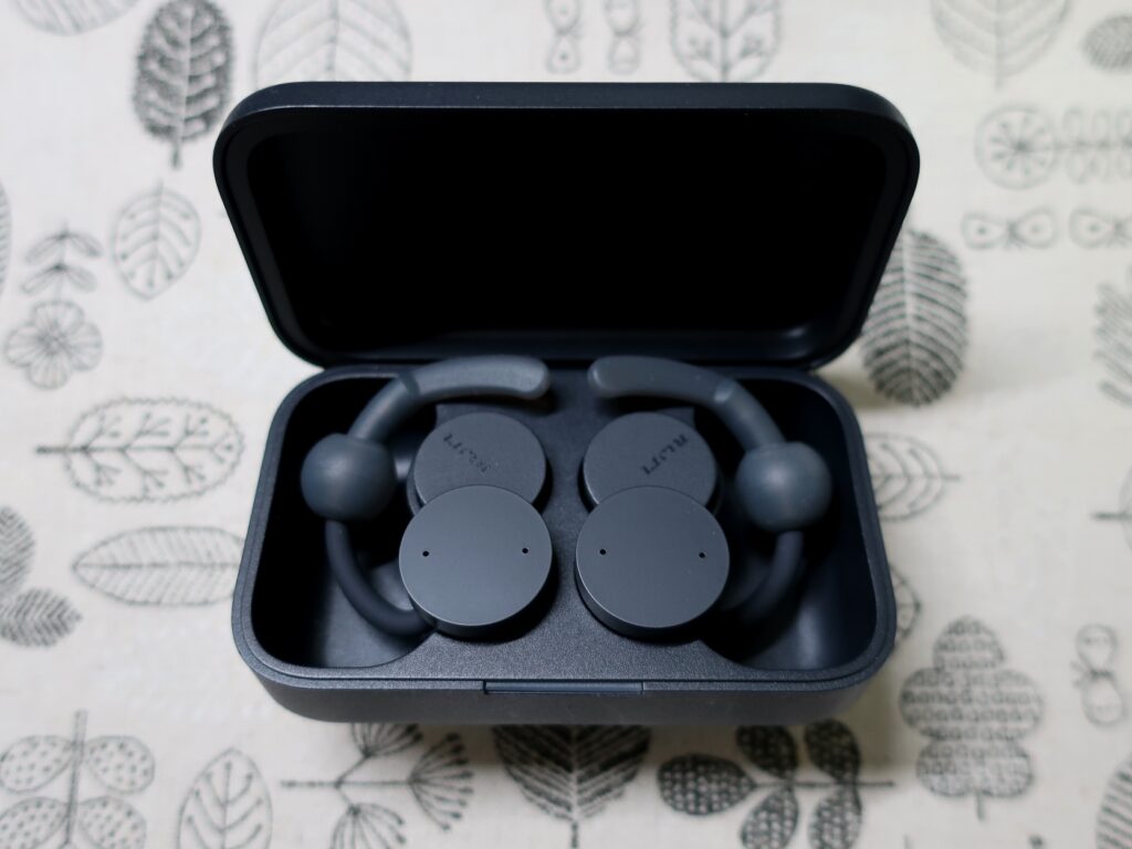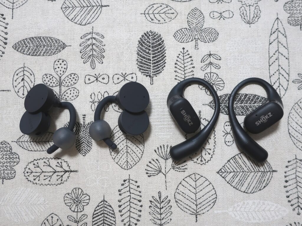 手持ちの「Shokz OpenFit」は片手で簡単に装着できズレにくいため、それと比べると差は歴然でした。実際に並べてみると、OpenFitの方がケース・本体ともにコンパクトに感じます。