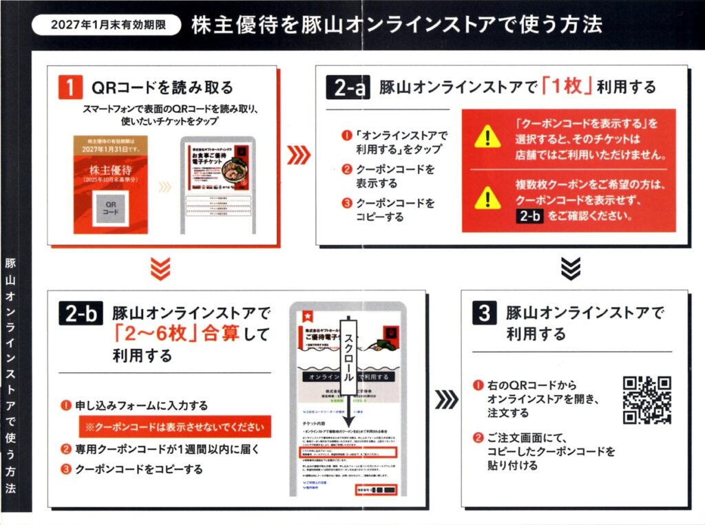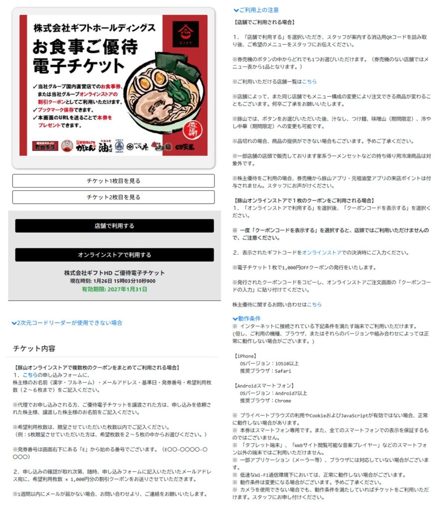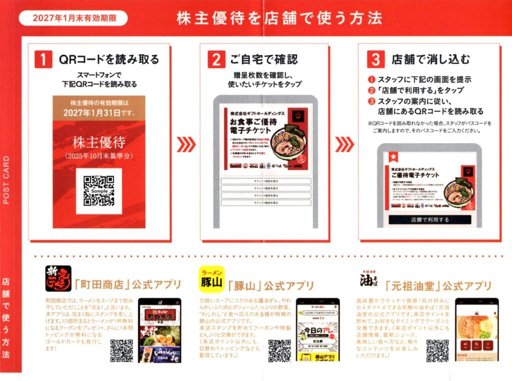 ギフトホールディングスでは、毎年4月末と10月末の権利確定日に、保有株式数と保有年数に応じて「ラーメン店などで使える電子チケット」がもらえます。