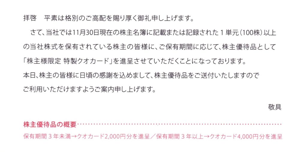 同社の株主優待は、3年以上継続保有すると額面が2倍になる長期保有特典があります。