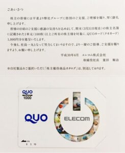 権利確定日は2018年3月末。保有株式数は100株。届いた優待品「1,000円分のクオカード」を写真で詳しく紹介します。