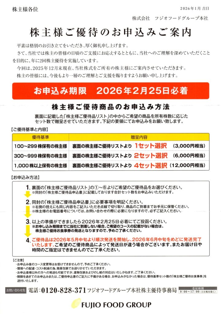 フジオフードグループ本社から株主優待の案内が届きました。