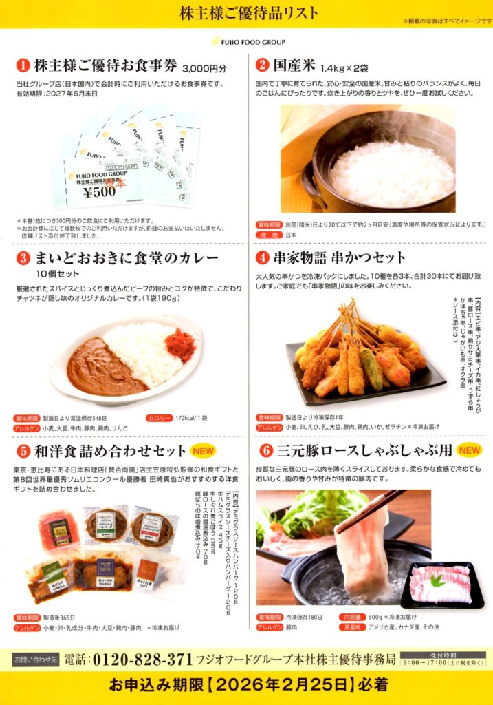 フジオフードグループ本社では、毎年6月末と12月末の権利確定日に以下の内容の優待がもらえます。