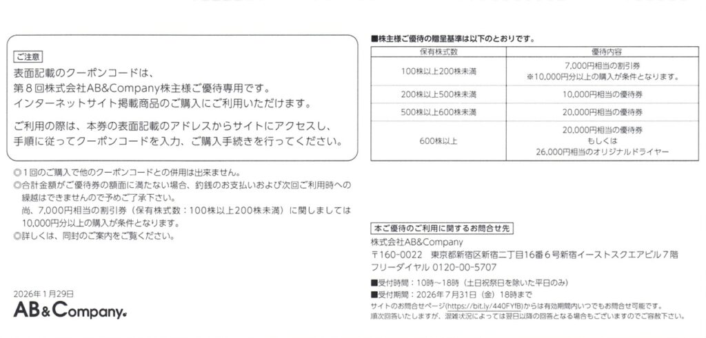 AB&COMPANY(9251)から株主優待が到着