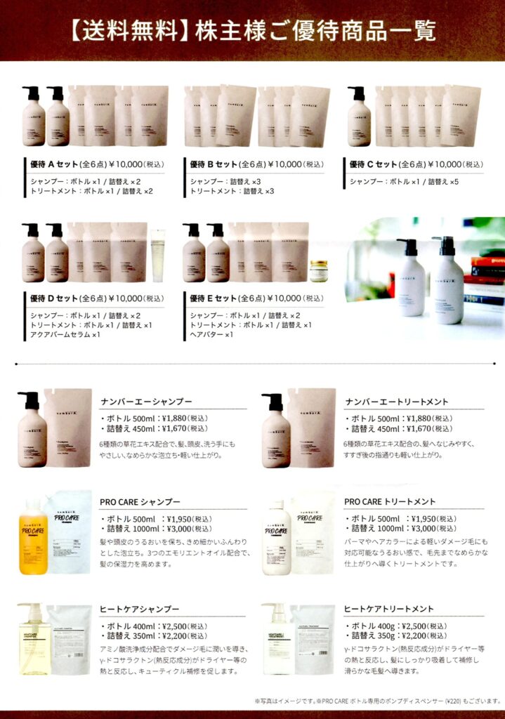 | 600株以上 | クーポンコード 20,000円分×1 もしくは 26,000円相当のオリジナルドライヤー |