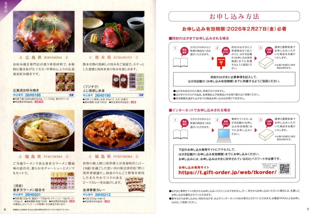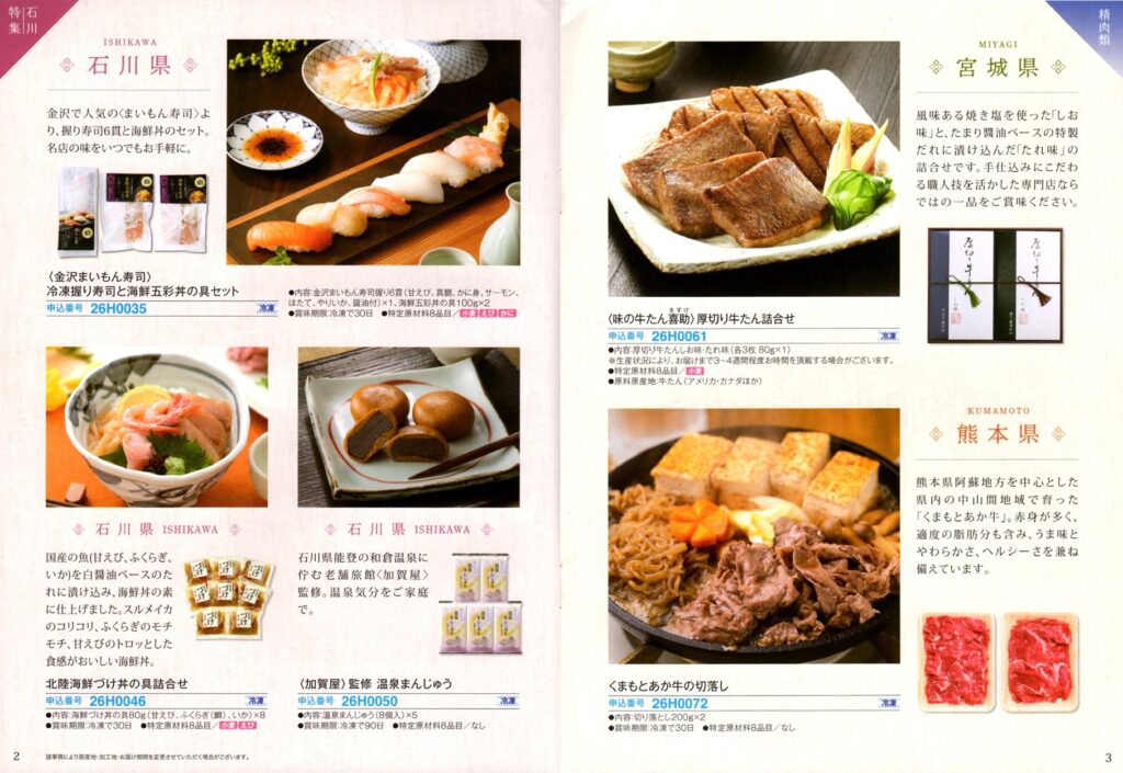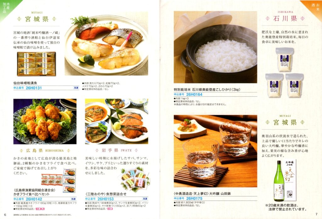 カタログには被災地(石川・岩手・宮城・福島県・広島・大分・熊本県)の特産品が21点掲載されています。