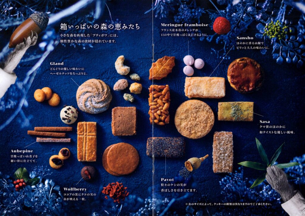 美しい青色の缶を開けると、森の恵みを活かした14種類の焼き菓子が隙間なくぎっしり。