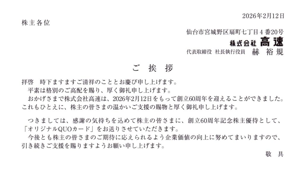 高速(7504)から創立55周年記念株主優待が到着