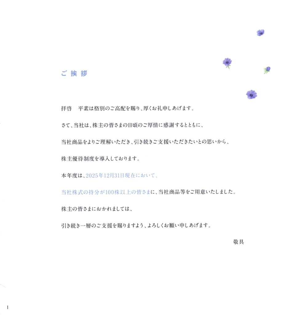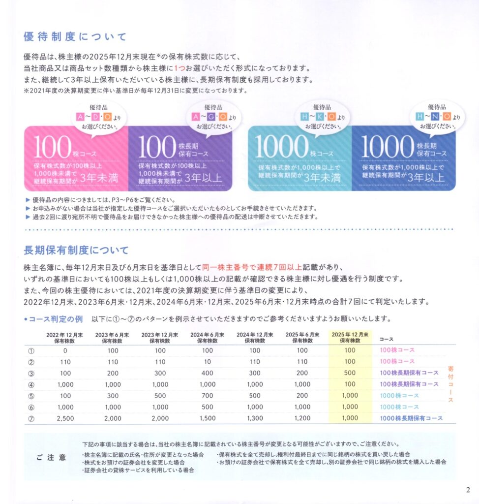 権利確定日は2024年12月末。保有株式数は100株(3年未満)。届いた優待案内(カタログ)を写真で詳しく紹介します。