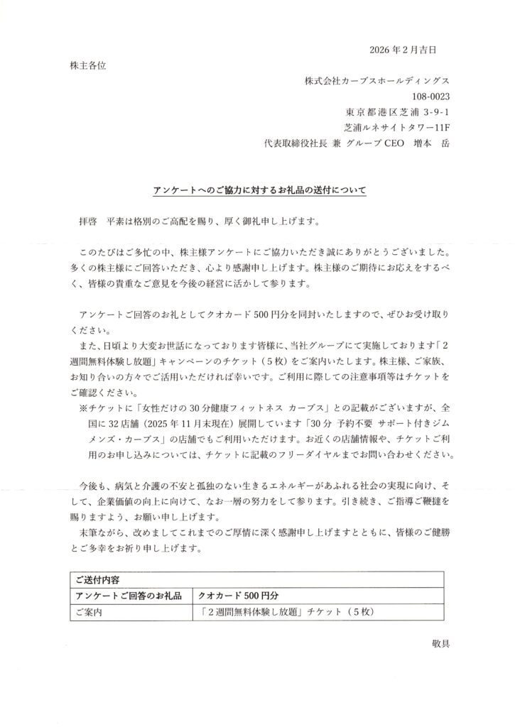 カーブスホールディングス(7085)からアンケートのお礼が到着