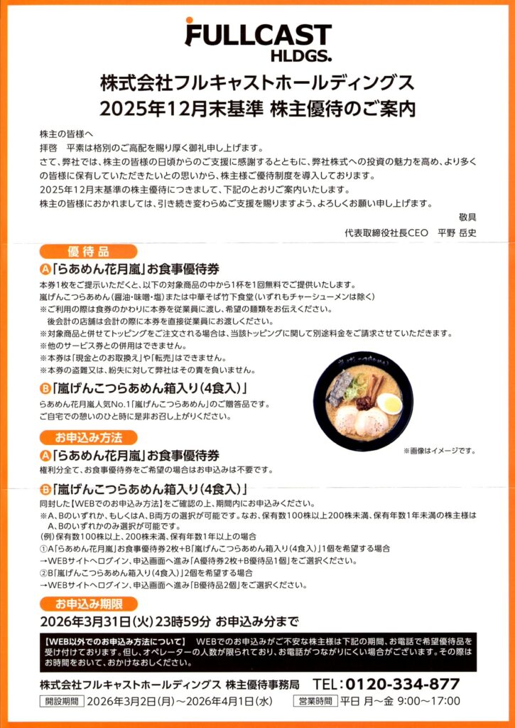 フルキャストホールディングス(4848)から株主優待の案内が到着