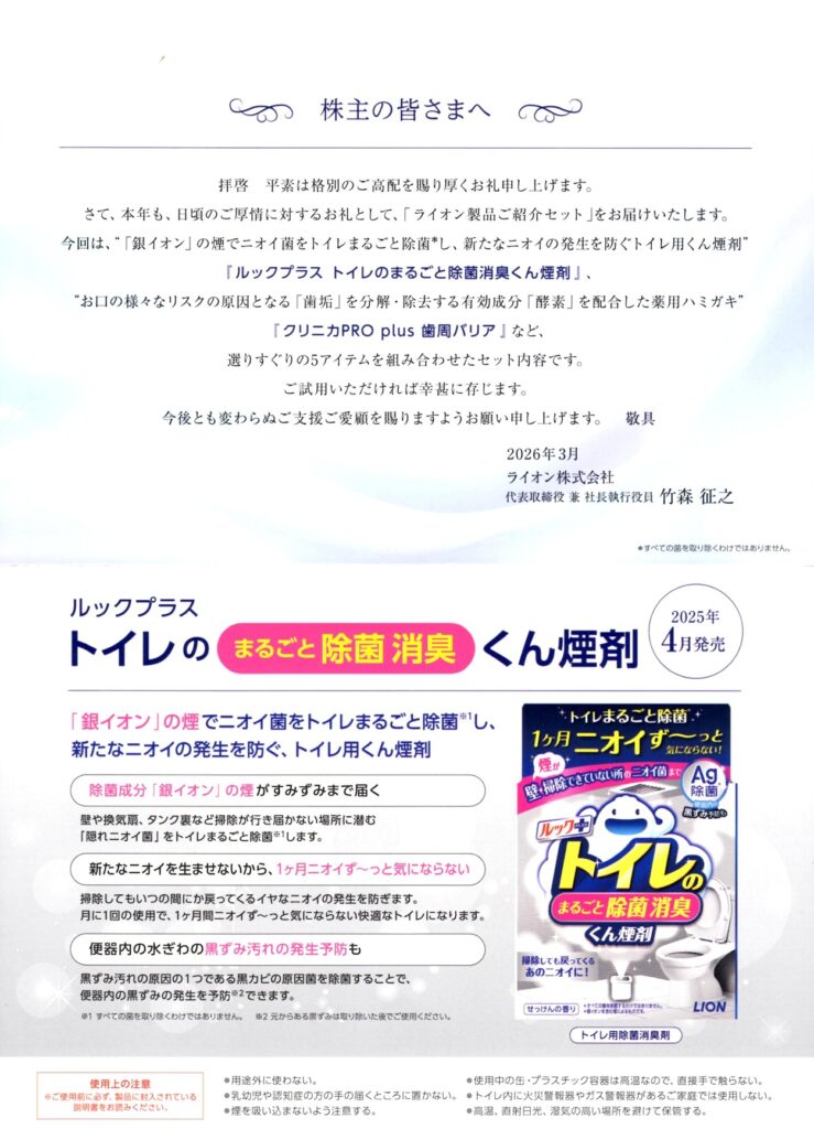 今回は、ハミガキや洗剤などの日用品でおなじみのライオン(4912)から届いた株主優待を紹介します。