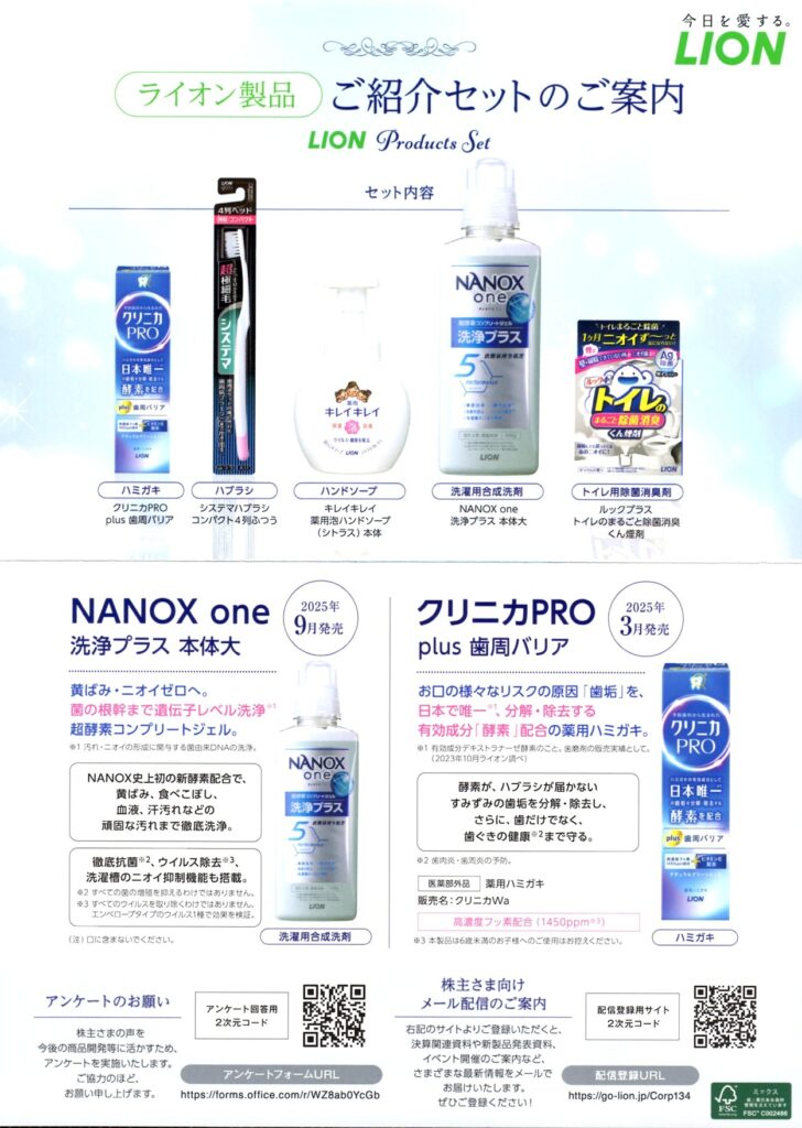 ライオンでは、毎年12月末の権利確定日に以下の内容の優待がもらえます。